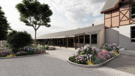 Der historische eingeschossige unterkellerte Flügelbau, der seinerzeit das zentrale Hauptgebäude flankiert hat, soll Wiederaufgebaut und wieder zu Gewerbezwecken genutzt werden. Insofern soll rechts neben dem zentralen Bürogebäude, welches die Hausverwaltung des Eigentümers ansässig hat, ein Restaurant untergebracht werden.